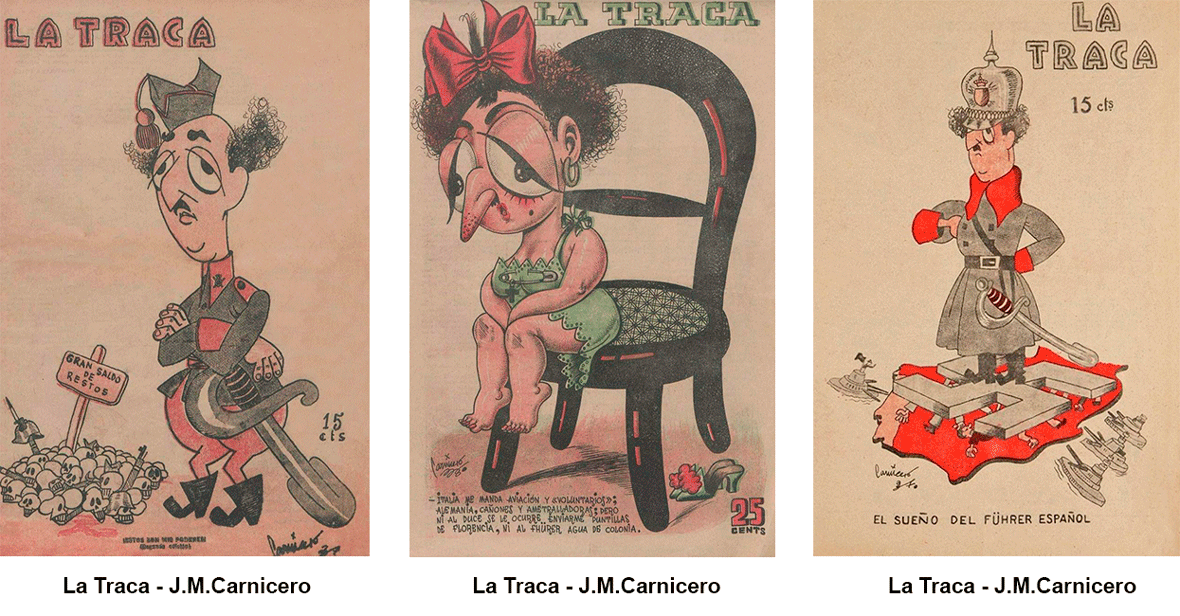 Nos unimos a los fastos conmemorativos del feliz acontecimiento recordando que hace 85 años ordenó asesinar a un periodista y a un dibujante. Mandó matar a Vicent Miguel Carceller y a Carlos Gómez Carrera “Bluff”. Evidentemente no le gustaron las imágenes que acompañan a este texto, de Bluff y Carnicero. A este último le cayeron 30 años. ¡¡Qué poco sentido del humor!!