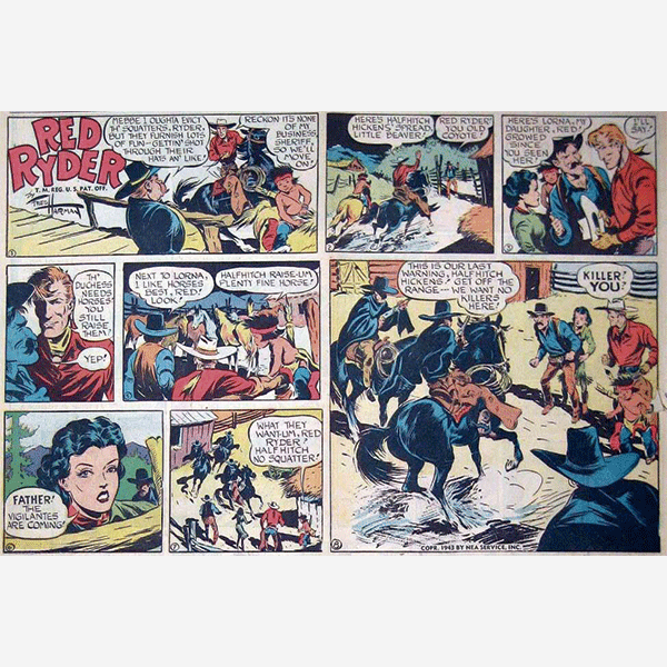 Red Ryder fue una tira cómica de western creada por Stephen Slesinger y el artista Fred Harman. Distribuida por Newspaper Enterprise Association, la tira se publicó entre el domingo 6 de noviembre de 1938 y 1965. Dibujada con un estilo realista, esta serie de aventuras se centra en el vaquero pelirrojo Red Ryder que, con la ayuda del huérfano indio Little Beaver (Castorcito en Hispanoamérica) y del sheriff Newt, recorre el Salvaje Oeste para luchar contra diversos bandidos. Harman ya había producido una tira cómica del oeste de 1934 a 1938 con un joven vaquero pelirrojo llamado Bronc Peeler. Wikipedia